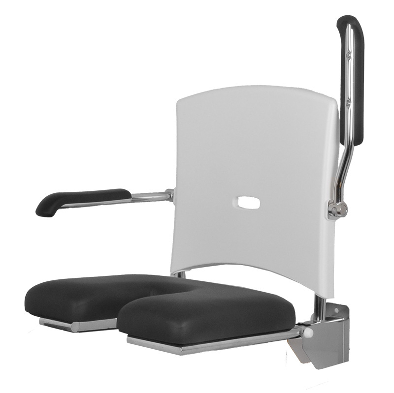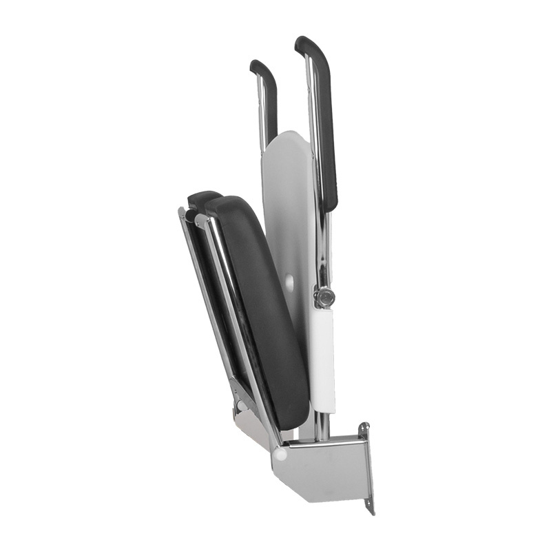 Het zitdeel is opklapbaar zodat de ruimte zo optimaal mogelijk gebruikt kan worden. Dit douchezitje kan worden voorzien van links/rechts opklapbare wandbeugels. Op deze manier worden krachten over de wand verdeeld en kan er een beugel met overstek worden geplaatst zodat er extra steun naast het standbeen wordt geboden.