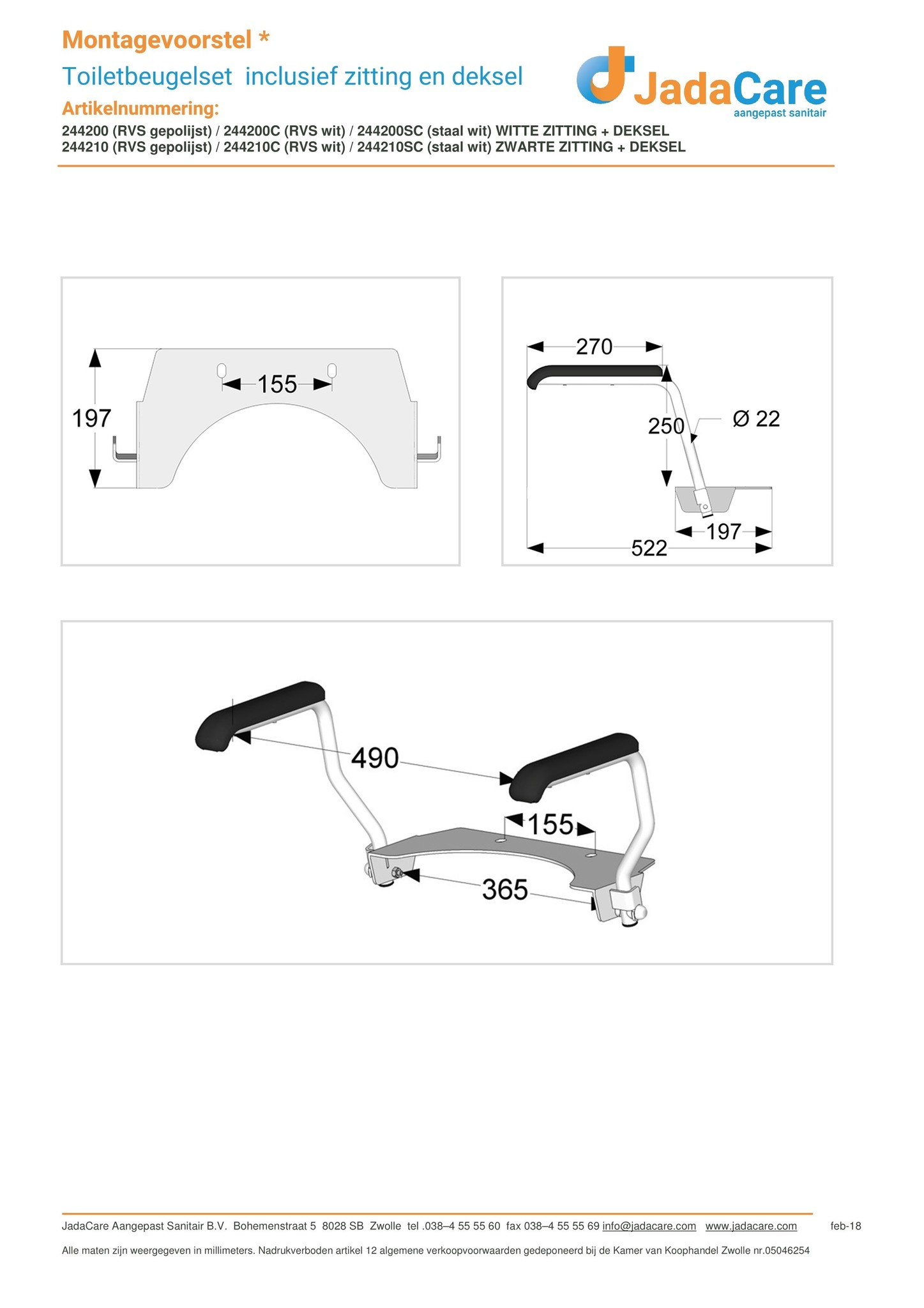 MONTAGE Toiletbeugelsets zijn eenvoudig, zonder boren, aan te brengen. De toiletbeugelset wordt vastgezet met de bevestiging van de toiletbril of vaste verhoger. In combinatie met een losse verhoger is een bevestigingsset (920003) benodigd om de plaat vast te zetten.